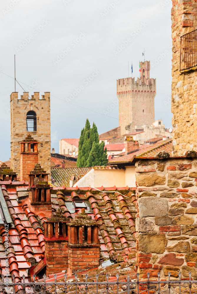 View of Arezzo medieval historic center characteristic roofs tiles, and chimney with old towers in the background