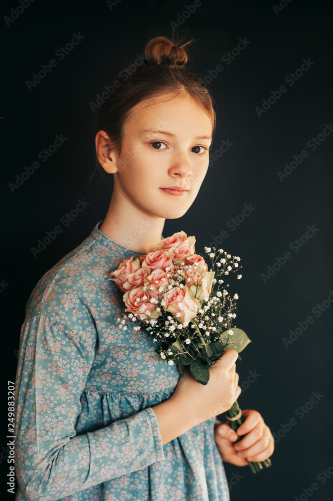 Art portrait of pretty young girl wth soft bouquet of pink roses