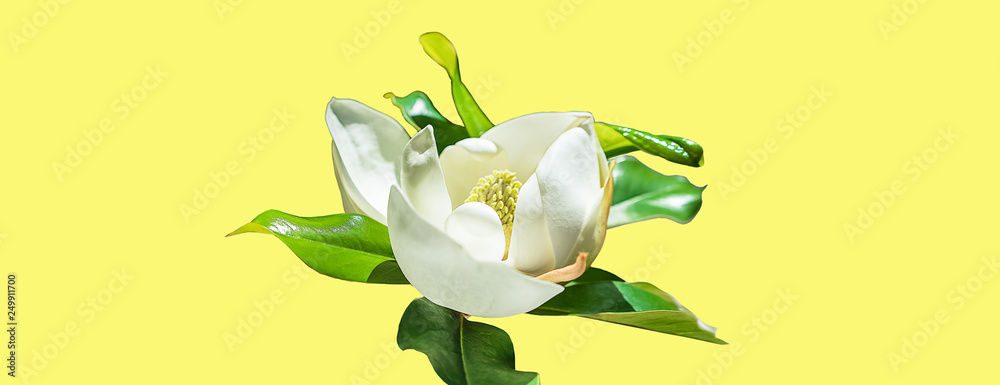 Beautiful magnolia flower bud on trendy neon yellow background. Spring Summer concept with white magnolia blossom. close up, selective focus, copy space