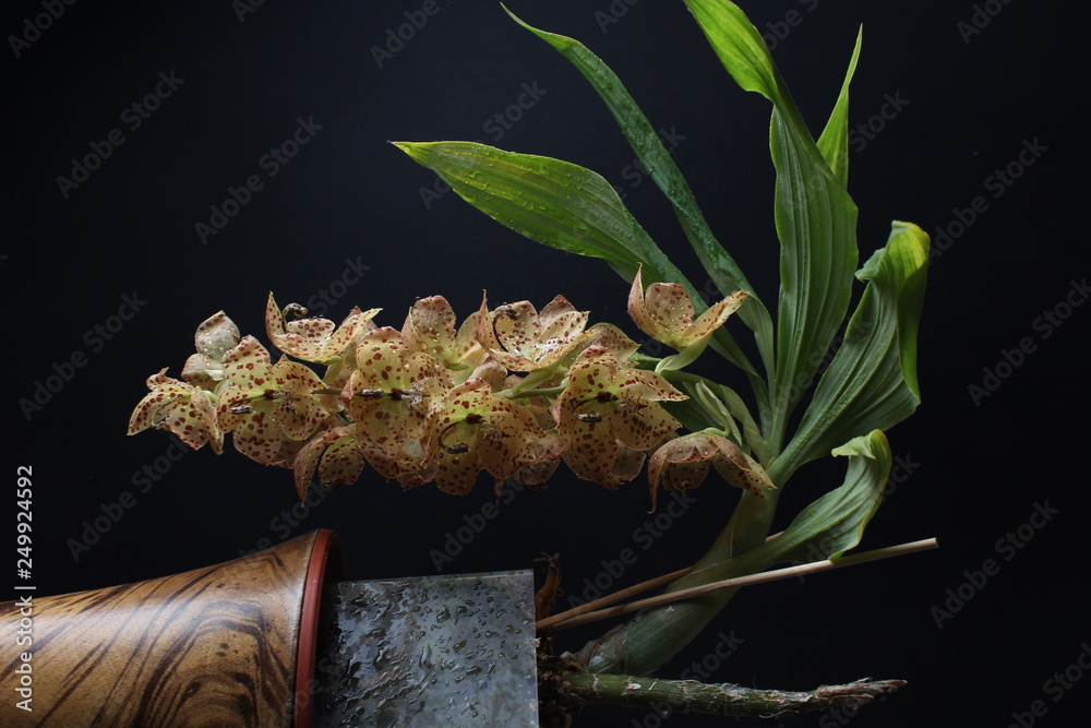 orchid yellow red specks on black background Cycnoches barthiorum ‘Pink Dove’