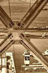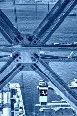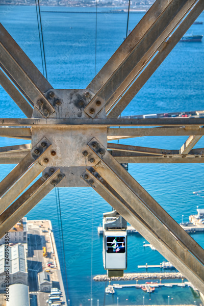One of the towers of the Gibraltar cable car, with the sea in the background