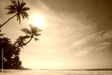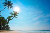 Tropical ocean shore with coconut palm trees. Empty vacation island beach.