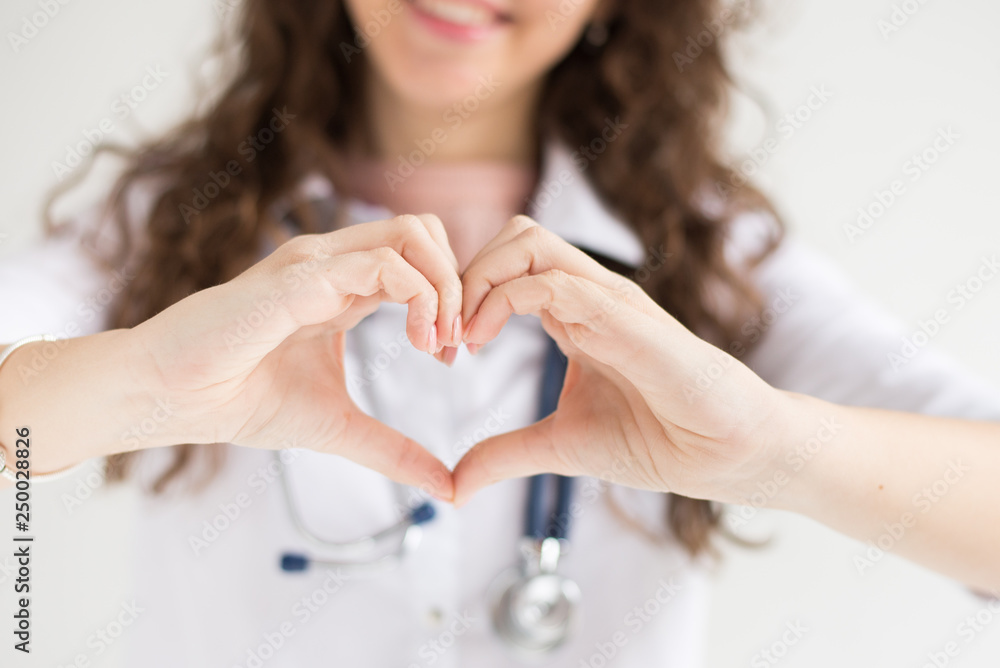 A doctor with his stethoscope shows heart of hands. clinic banner panoramic crop for copy space.