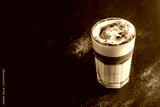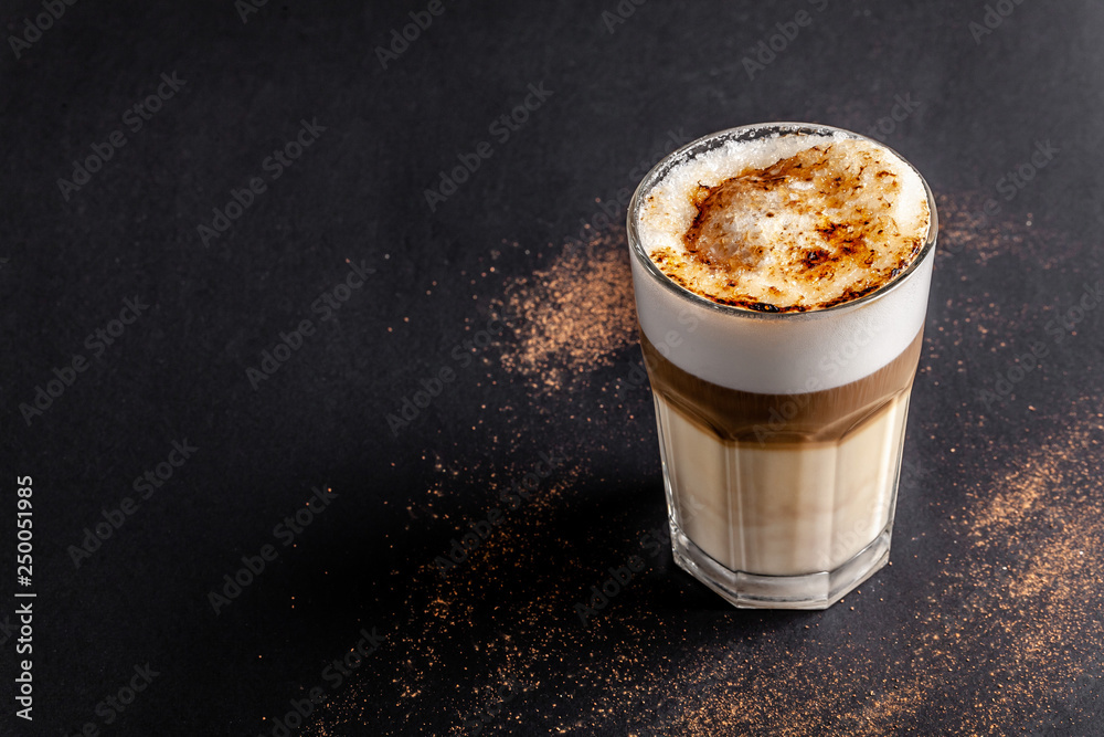 A modern, lactose-free Latte or Cappuccino coffee with almond milk. Above the fire sugar burned sugar. Caramel crust. Drink in a glass tumbler. copy space