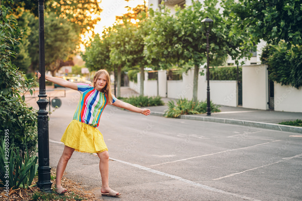 Summer portrait of pretty kid kid girl posing outdoors, wearing yellow skirt and colorful blouse