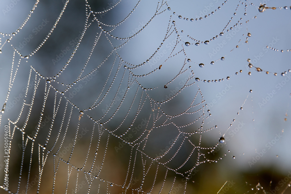 Maytina on the tree. Water drops of dew on a spider web. Predator in anticipation of prey