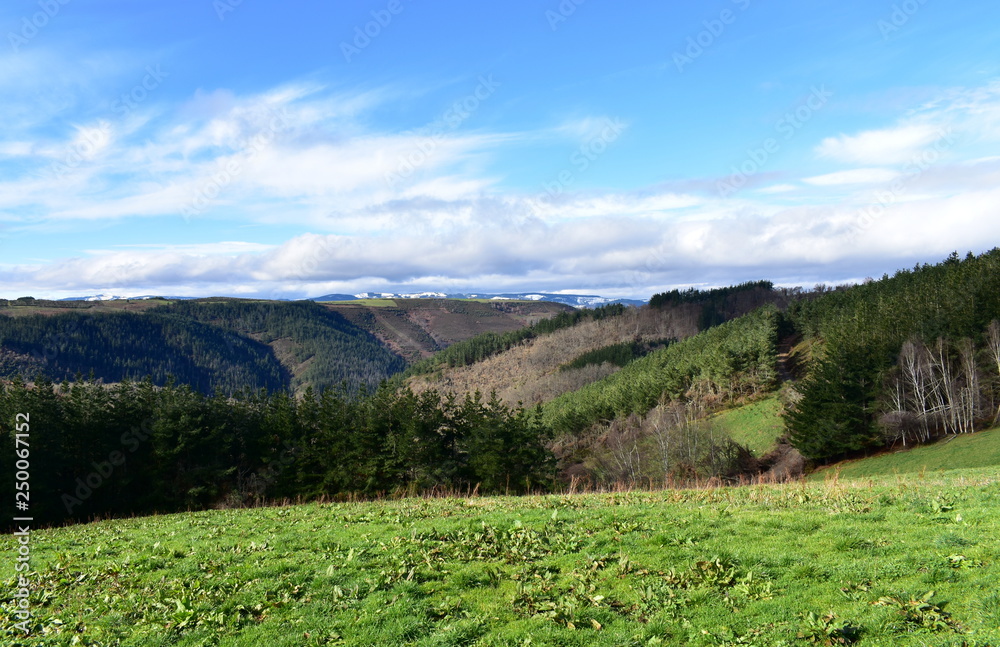 Winter landscape with green field, valley with forest and snowy mountains. Ancares Region, Lugo Province, Spain.