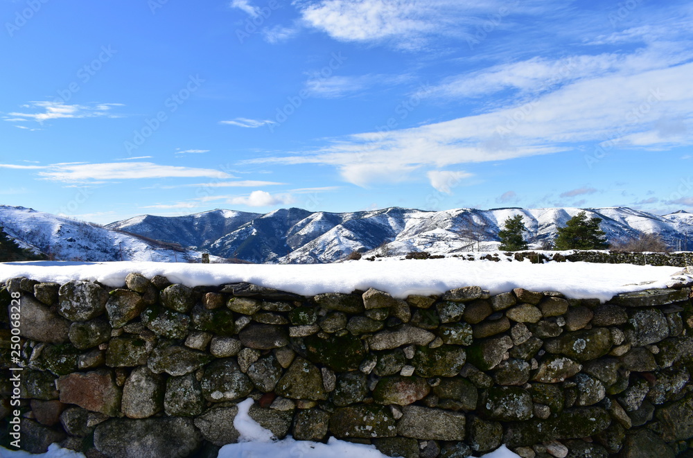 Winter landscape with snowy stone wall and mountains. Piornedo Village, Ancares Region, Lugo Province, Spain.