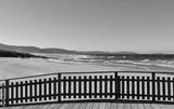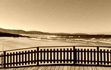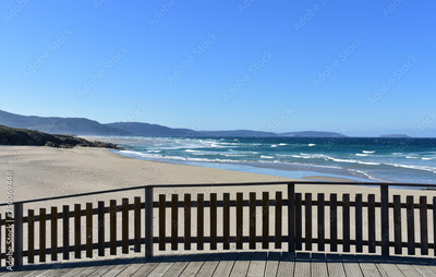 Wild beach with golden sand and wooden boardwalk. Blue sea with waves and foam, sunny day. Galicia, Spain.