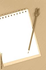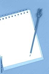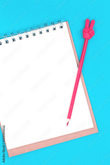 A red pencil with V sign and a blank notepad on blue background. Flat lay with copy space
