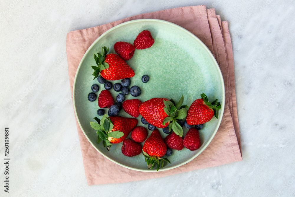 Mixed berries in conrete plate on marble background with empty plate and copy space