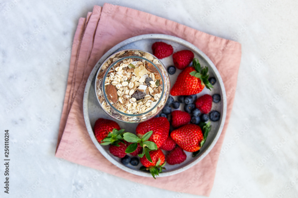 Mixed berries in conrete plate on marble background with empty plate and copy space