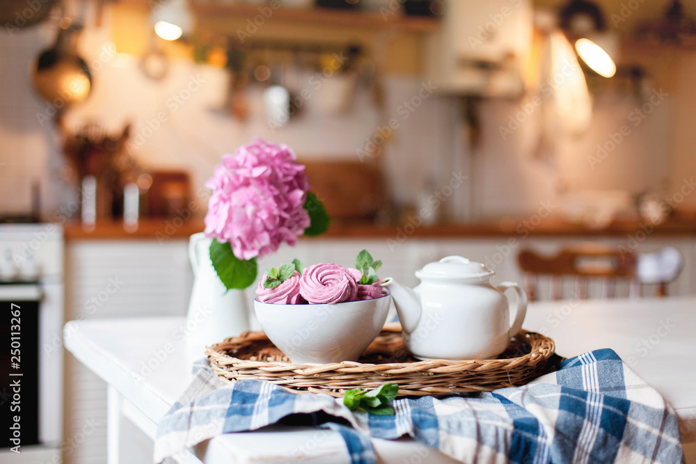 Morning breakfast on kitchen table. White teapot, pink marshmallows and hydrangea flowers are serving on straw tray. Tea time, cozy home atmosphere hygge. Spring still life with sweets.