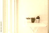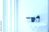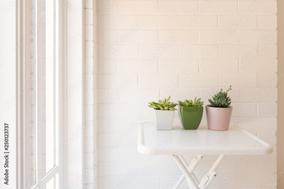 Three succulent plants in coloured pots on white table against wall next to window (selective focus)