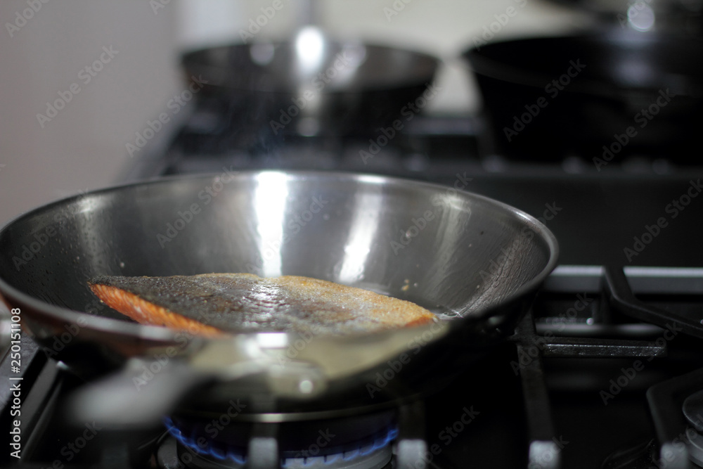 Wild caught Coho salmon frying in a pan with the skin side up.