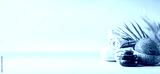 Tropical spa setting background with coconut, palm leaves at light blue. Massage treatment. Rolled towels, compress balls and hot stone. Beauty, wellness and body care. Banner or template. Copy space