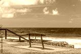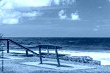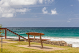 Empty park bench overlooking turquoise ocean water
