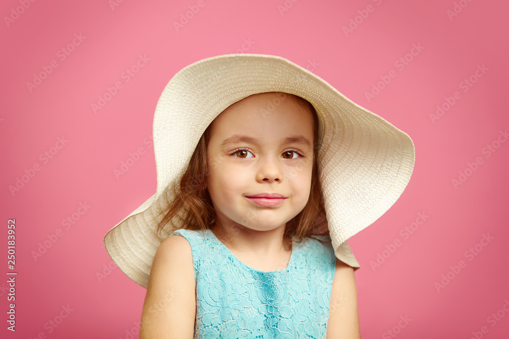 Little beautiful girl in beach hat and blue dress on pink isolated background.