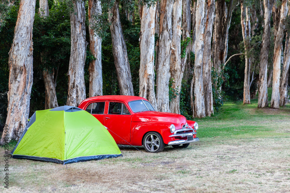 Red vintage car parked next to a small tent on green grass under trees
