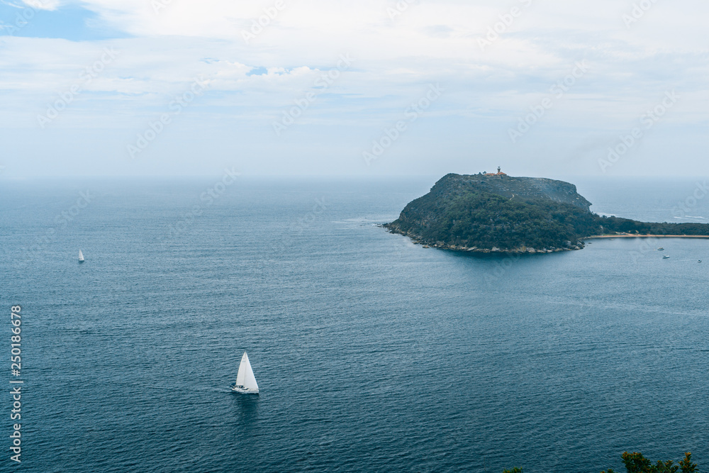 Sailboats sailing around Barrenjoey Head Lighthouse in misty weather. Sydney, Australia