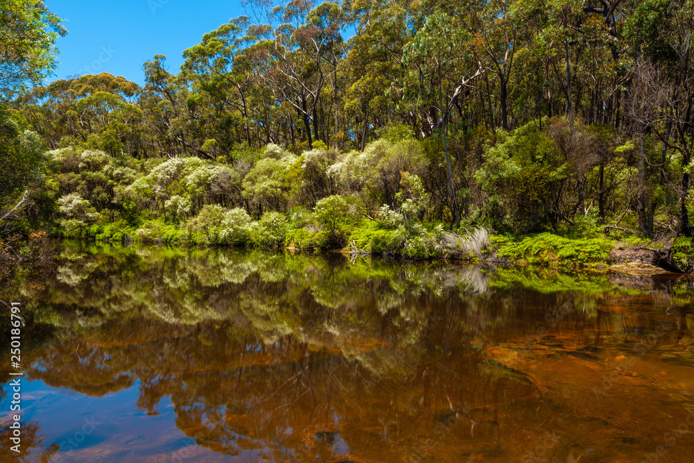 Native Australian vegetation reflecting in calm waters of Kangaroo river.