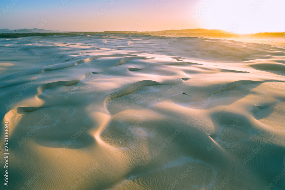 Sunrise over pristine sand dunes with beautiful shadows - aerial landscape