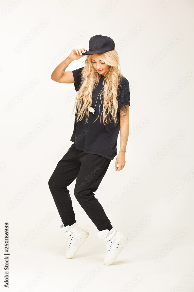 fashion woman portrait wearing stylish swag look of black garment on white isolated.