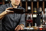 Close up shot of sommelier pouring red wine from bottle in glass