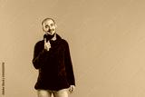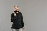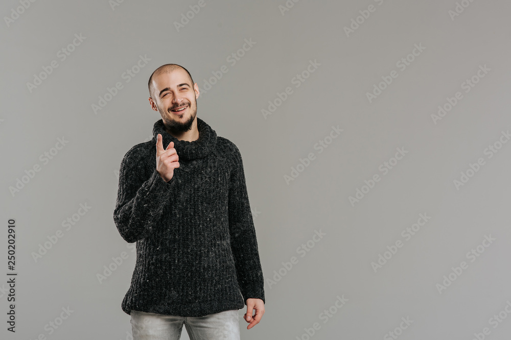 Handsome man raised his index finger and looking at the camera, isolated on gray background. Concept of the idea or warning