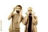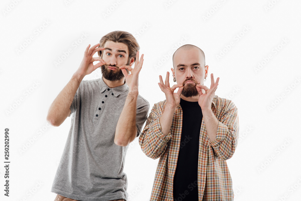 two men are grimacing with the mustaches, isolated white background, copy space