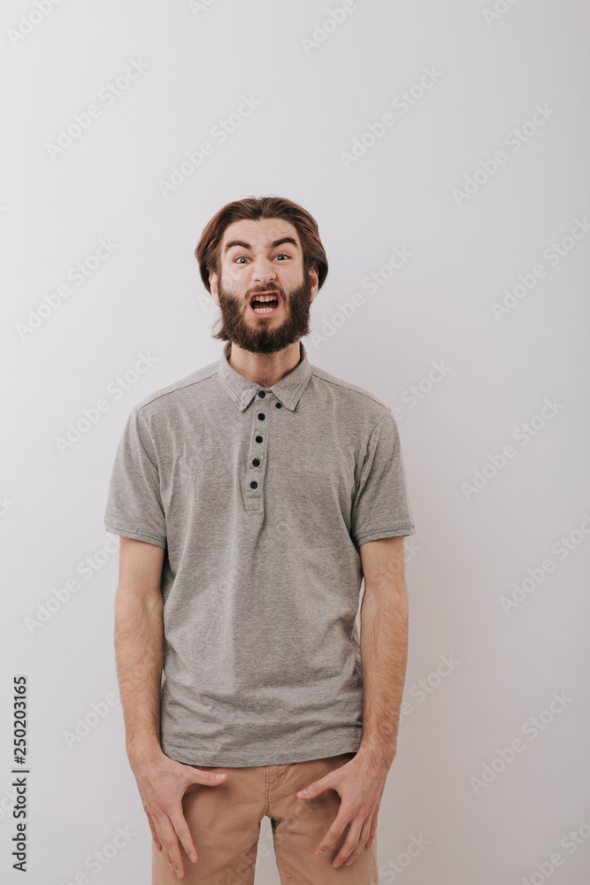 angry young man, looking into the camera, isolated background gray, copy space