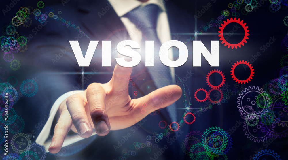 A businessman pressing a Vision business concept on a graphical display of cogs