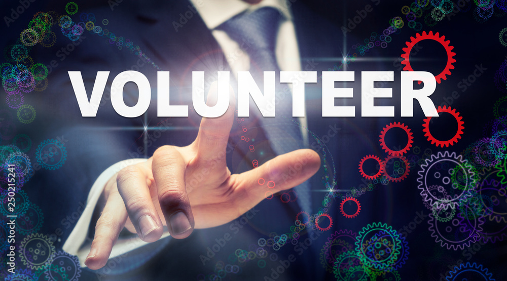 A businessman pressing a Volunteer business concept on a graphical display of cogs