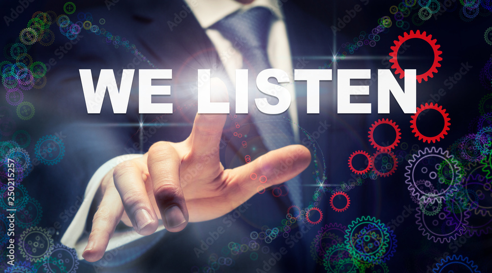 A businessman pressing a We Listen business concept on a graphical display of cogs