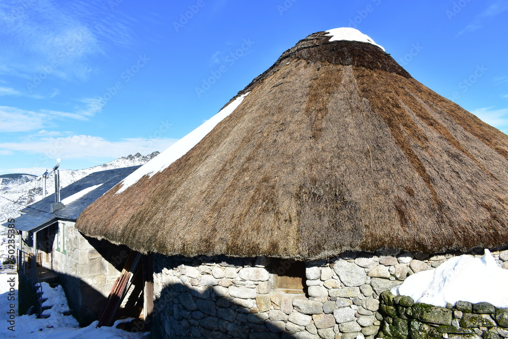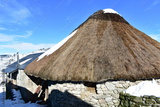 Ancient snowy palloza house made with stone and straw. Piornedo Village, Ancares Region, Lugo Province, Spain.