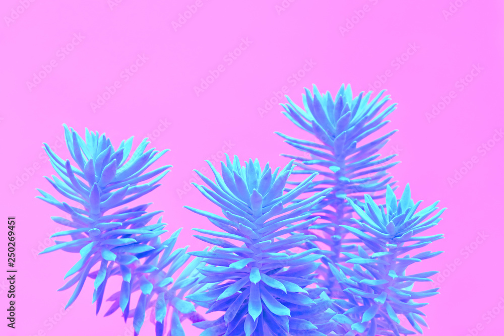 Fashion Neon tropical aloe in Blue Color. Minimal Trendy stillife on Pink Design background. Art concept. Close-up aloe plant.