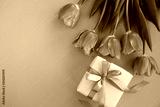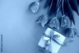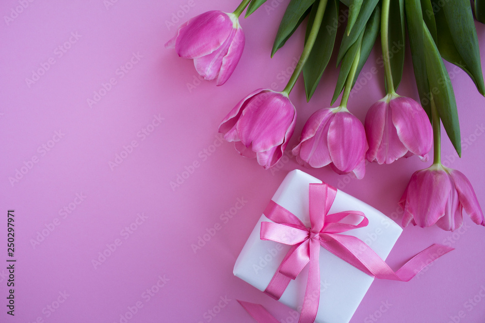 Gift with pink bow and pink tulips on the pink background.Top view.Copy space.