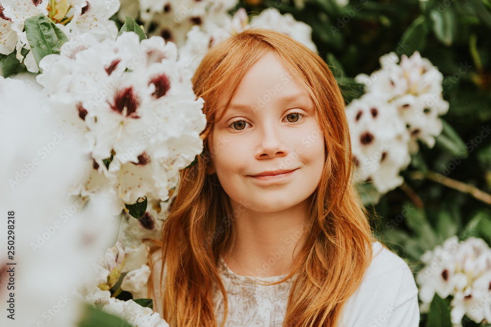 Portrait of adorable little girl of 8-9 year old . Red-haired sweet young girl playing in spring garden