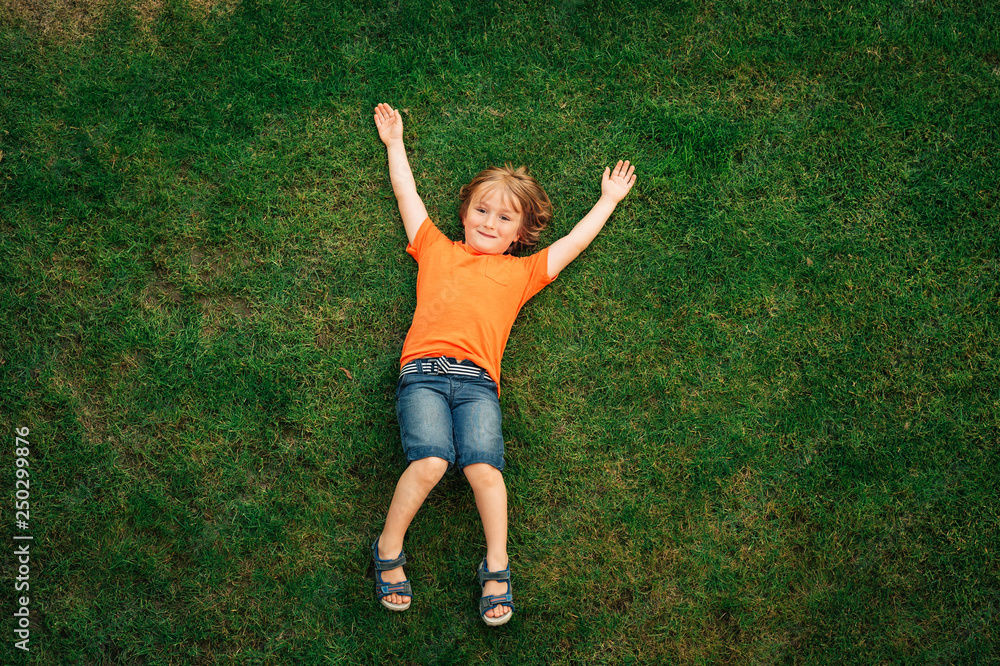 Happy child having fun outdoors. Kid playing in summer park. Little boy lying on green fresh grass, top view