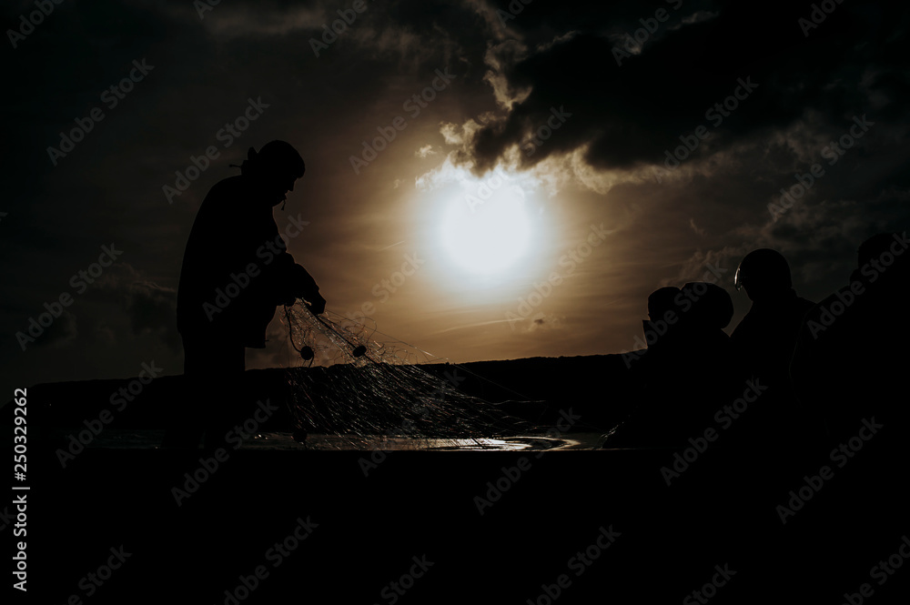 Fishermen in boat with nets