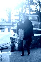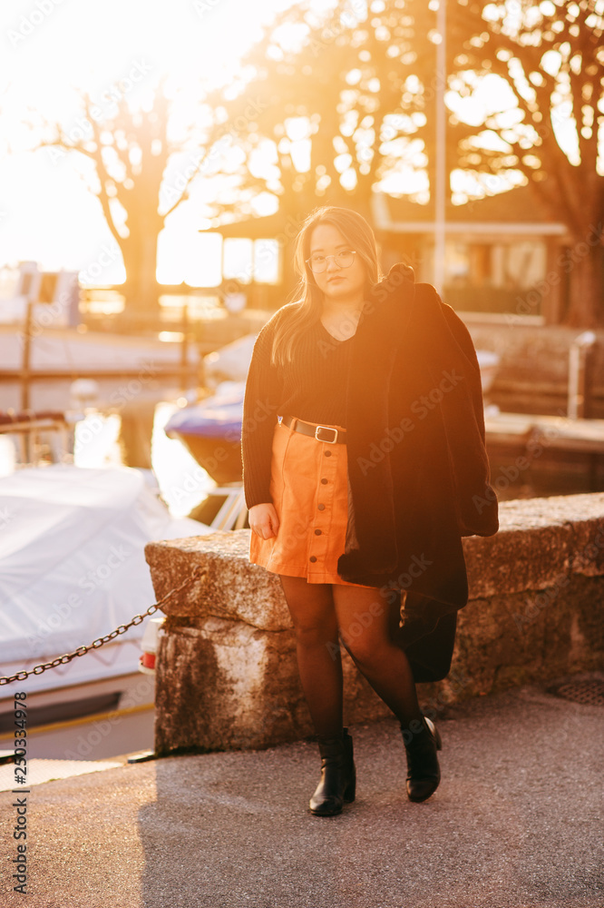 Outdoor portrait of asian plus size model, holding black faux fur coat, posing next to lake