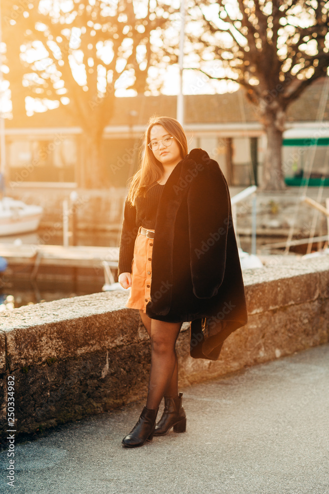 Outdoor portrait of asian plus size model, holding black faux fur coat, posing next to lake