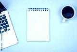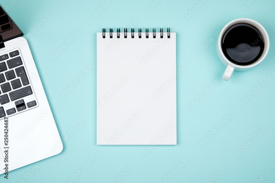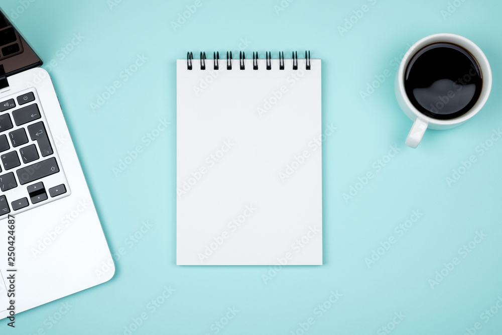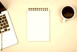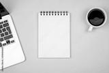 Designer office desk with blank notebook page and laptop