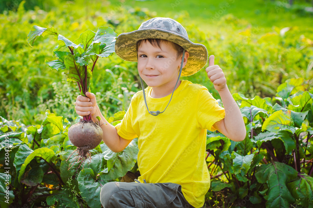Cute little boy holding a bunch of fresh organic carrots and beets in domestic garden