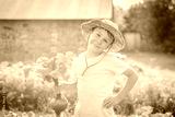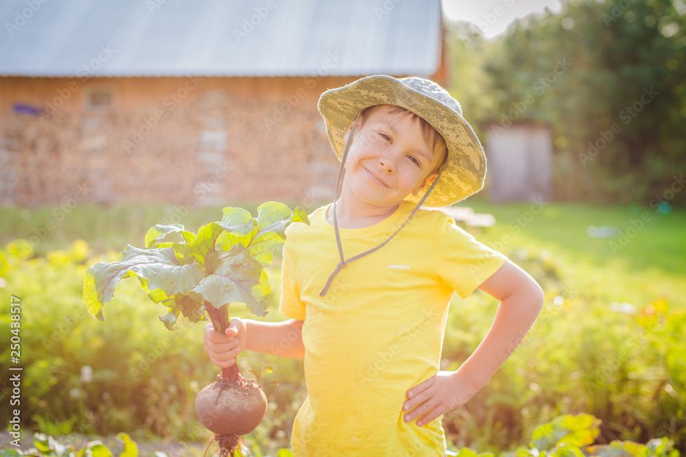 Cute little boy holding a bunch of fresh organic carrots and beets in domestic garden