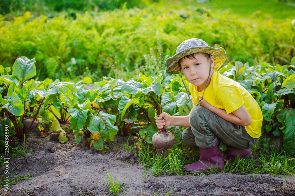 Cute little boy holding a bunch of fresh organic carrots and beets in domestic garden