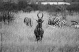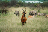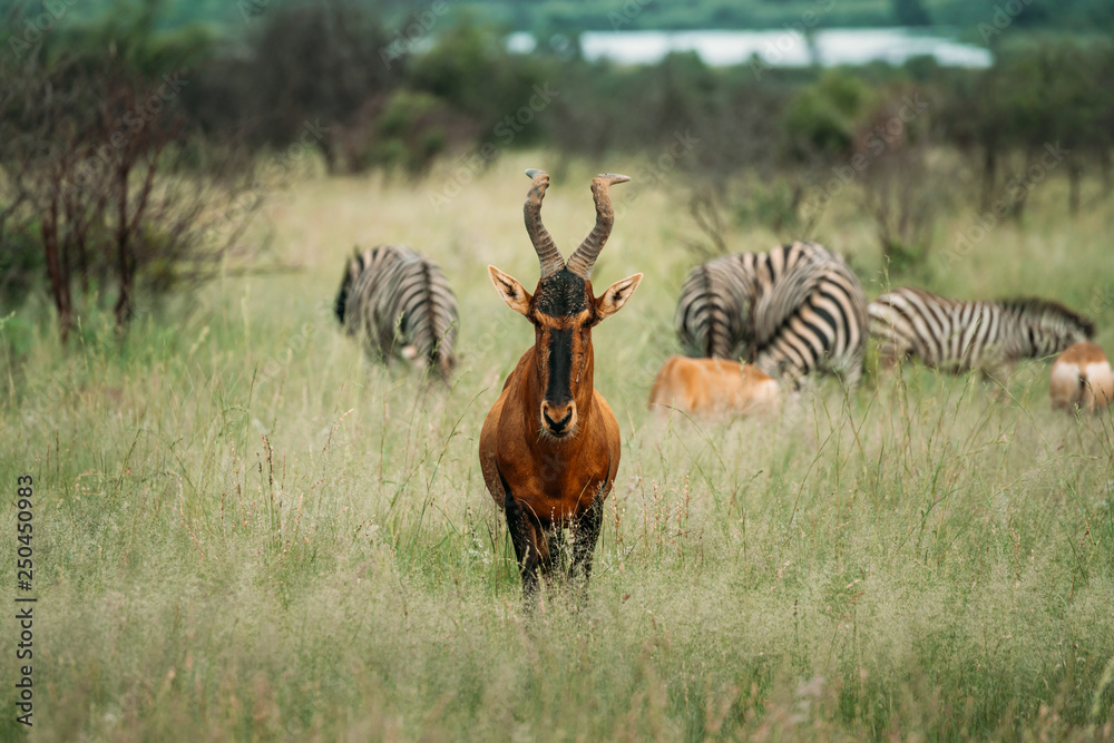 Red hartebeest looking into the camera. Standing in green grass with zebra and other animals behind it. Taken during the rainy season in Pilanesberg South Africa