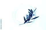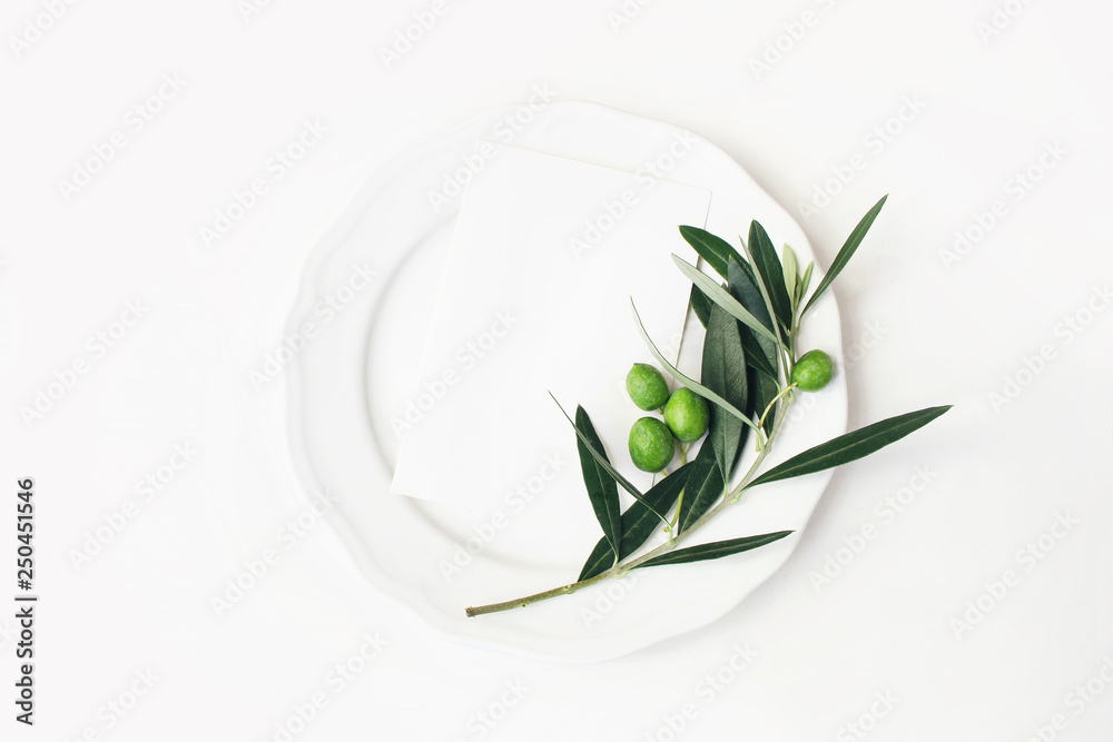 Festive table summer setting with olive leaves, branch and fruit on porcelain plate. Blank paper card mockup scene. Mediterranean wedding or restaurant menu concept. Flat lay, top view.