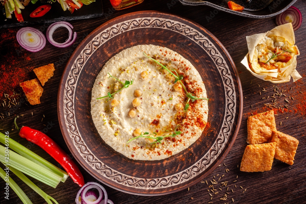 The concept of Arabic cuisine. Oriental hummus with grilled sesame and pistachios. Laid arabic table for the holiday. Background image. Top view, copy space