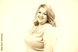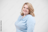 Young obese woman in casual blue clothes on a white background in the studio. Bodypositive.